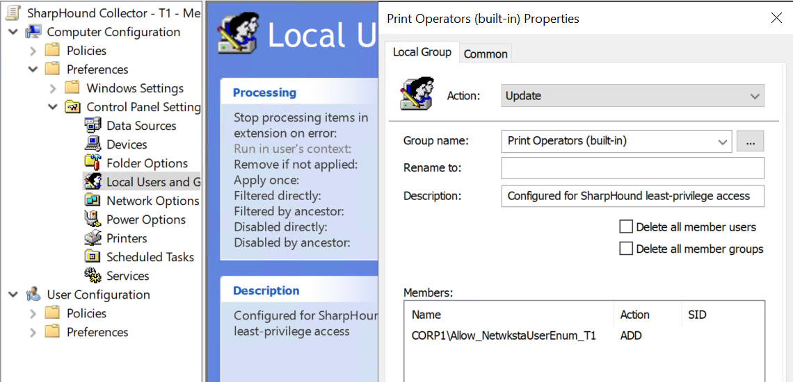 For example, if our Tier Zero SharpHound collector gMSA is a member of the Allow_SamConnect_T0 group, a GPO configured like this and linked to the Tier Zero OU where all of the non-DC Tier Zero assets are located, SharpHound will be able to collect Local Group data from those hosts.