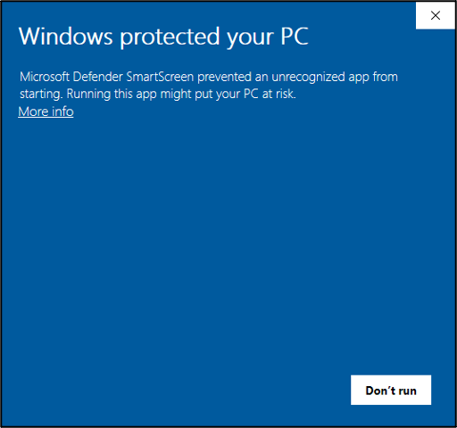 - SmartScreen may display a warning if you are running Microsoft Defender: